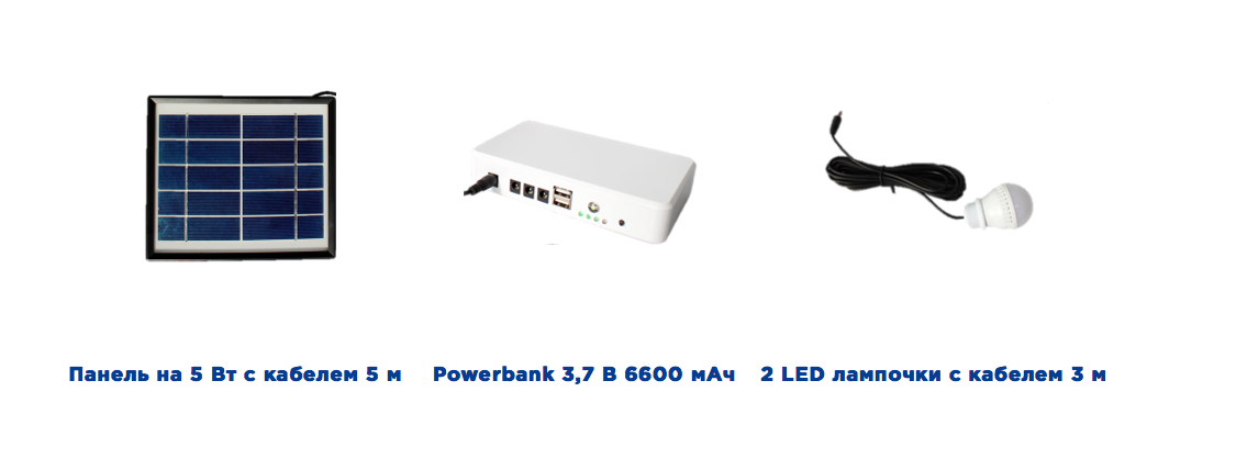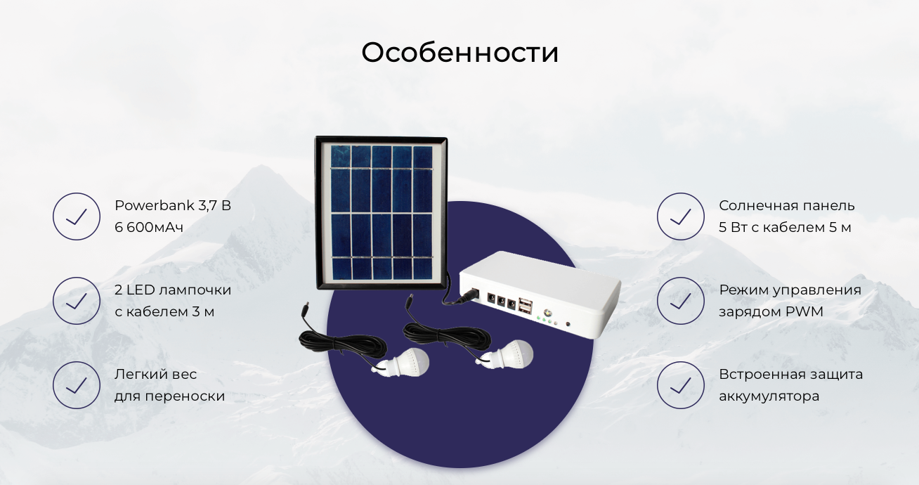 Зарядная министанция емкостью 6 600 мАч с источником энергии от солнечной панели (идет в комплекте). Подключение двух светодиодных ламп и мобильных устройств через USB-порты.