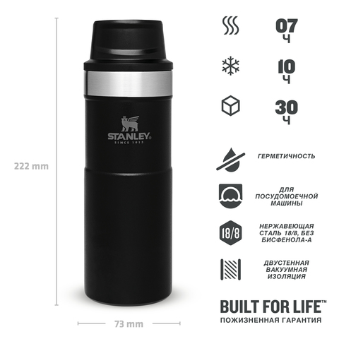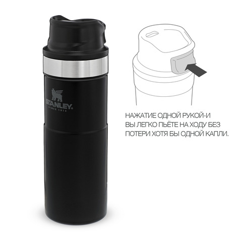 Термокружка Stanley Classic One hand 2.0 0.47 л, черная 10-06439-031 используется путешественниками и любителями активного отдыха.